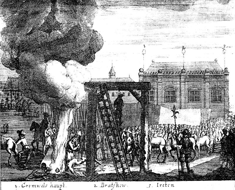 革命の指揮を執ったのがオリバー・クロムウェル (Oliver Cromwell, 1599-1658)であった。しかし共和政体も長くは続かず、1660年にチャールズ2世を国王に迎えた王政復古後は、ご存知のように今日までイギリスでは王政が続いている。[閑話:クロムウェルは死後、反逆者として墓を暴かれ、遺体はタイバーン刑場で絞首刑の後斬首され、首はウェストミンスター・ホールの屋根に掲げられて四半世紀晒されたという。右の画像後方の屋根に立つ三本の柱の左側がクロムウェル、中央が国王裁判において裁判長を務めたジョン・ブラッドショー (John Bradshaw)、右がクロムウェルの娘婿で、ネイズビーの戦いで国王軍に壊滅的な損害を与えた議会軍のヘンリー・アイアトン(Henry Ireton)少将] 悪事を働く宿の主の腹の中には「クロムウェル側について戦い倒れた息子」のことを一度たりとも忘れることはなかったという理由があったという。すると息子は、議会軍の一員として国王軍と戦って戦死したということになる。「無法時代」とは、このイングランド内戦の時代を指していよう。
