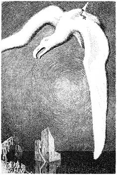 (第V部) やがて雨が降り始め、船はふたたび動き出し、稲光と月光の下、死んだ者たちが呻き、うごめき、一斉に立ち上がって、みんな元の持ち場に戻ってゆく。突然飛び跳ねたように動いた船に、自分は気を失って倒れる。