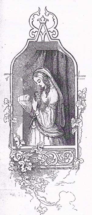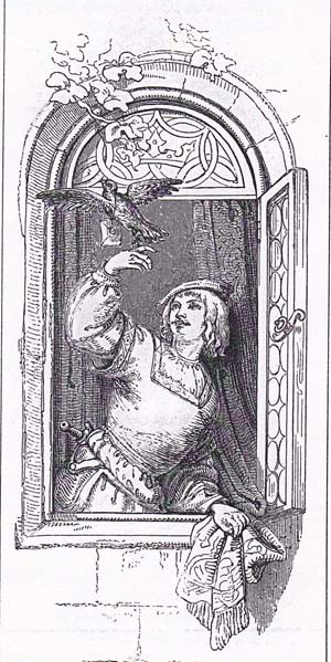 男が飼っている大鷹は、イングランドの恋人のところに手紙を持って行って、返事をもらって来るように頼まれる。「どうしてご主人様の/愛(いと)しい人がわかるでしょう/声を聞いたことも/顔を見たこともないというのに」と大鷹が訊ねると、誰よりも一番美しい人だからすぐに分かる、と言われる。飛んで行った恋のメッセンジャーの大鷹は、恋人からの手紙を渡して、「さあこれがご主人様のお手紙です/もう三通も送ったとおっしゃいます/これ以上は待てないと/あなたを思って死ぬほどです」云々と言うと、女は「あの方に結婚のパンを焼くように/結婚のエールを醸(つく)るように伝えておくれ/美しいスコットランドでお会いしましょう/パンとワインが腐ってしまうその前に」と応える。[二葉の挿絵はいずれもS. C. Hall編集のThe Book of British Ballads (1844)より]