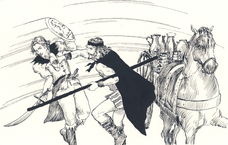 ある日のこと、一人の焼物師がやって来る。一度も関銭(せきせん)を払ったことがなく無礼な男だから懲らしめてやろうというロビンの提案に、リトル・ジョンは、自分が今までに三度も闘って負けており、誰一人勝てる相手ではないと言う。しかしロビンは、自分が関銭(せきせん)を払わせてみせると豪語し、焼物師の馬を止める。勝負は簡単、一撃を首に食らってロビンは地面に倒れる。(ロビンが天下無敵という設定になっていないことはどの時代においても共通しているようであるが)負けたロビンは潔く、「これからはいつでも好きなときに/構わずこの道を通られるがよい」と言った上で、「お近づきの印として/わしと服を交換してはもらえぬか」と申し出る。快諾を得たロビンは独り、焼物商売にノッティンガムに向かうのであった。ここまでが前半部で、次からは焼物師に変装したロビンの話である。(「変装」は、ロビン・フッド物語の題材の重要な一つである。)